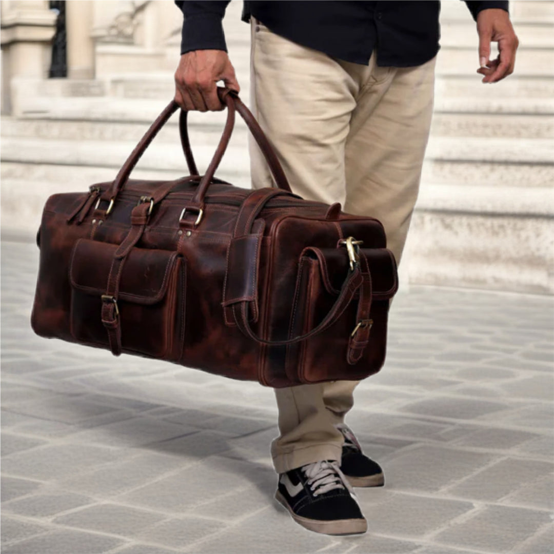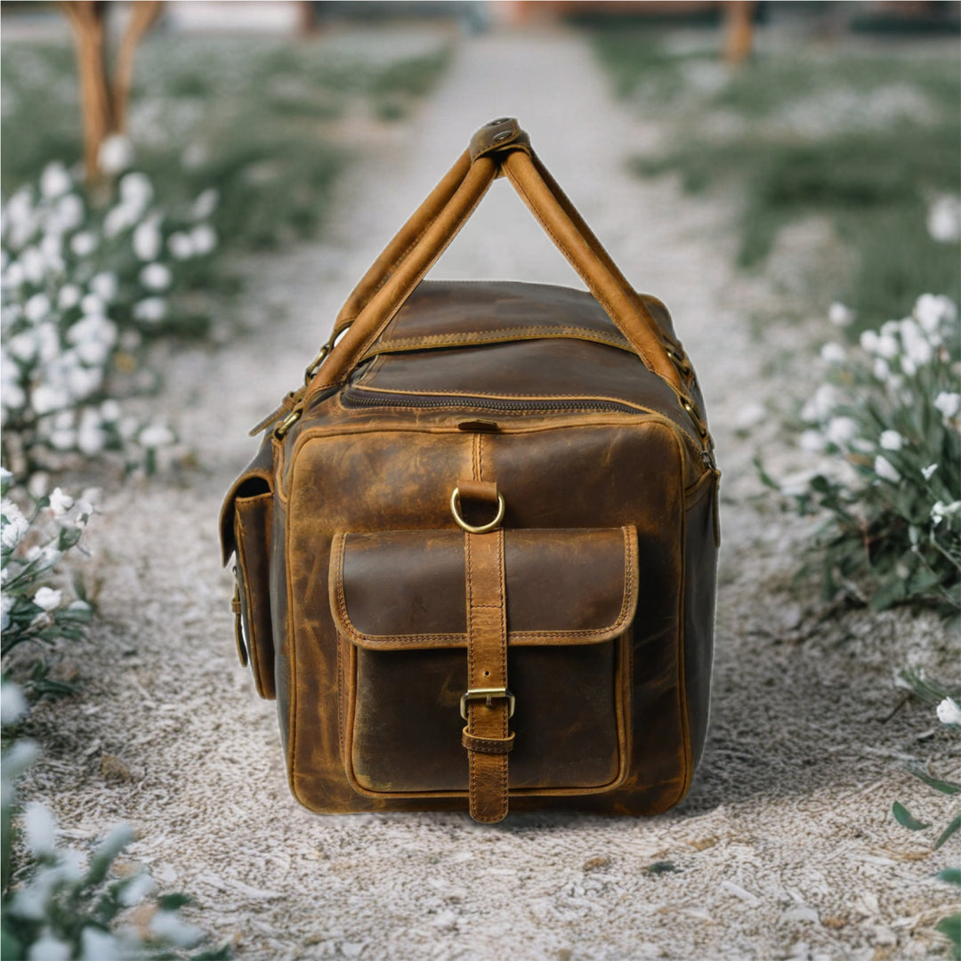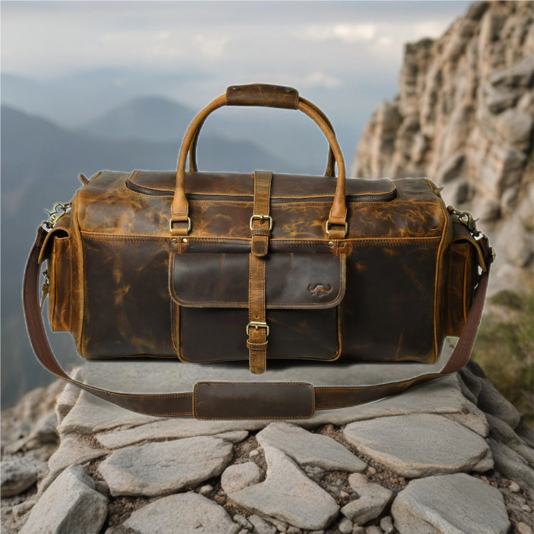 Crafted from full grain buffalo leather in a deep sepia tone, this retro-inspired duffle combines timeless design with rugged utility. Spacious, durable, and stylishly versatile—perfect for those who travel with purpose and personality.